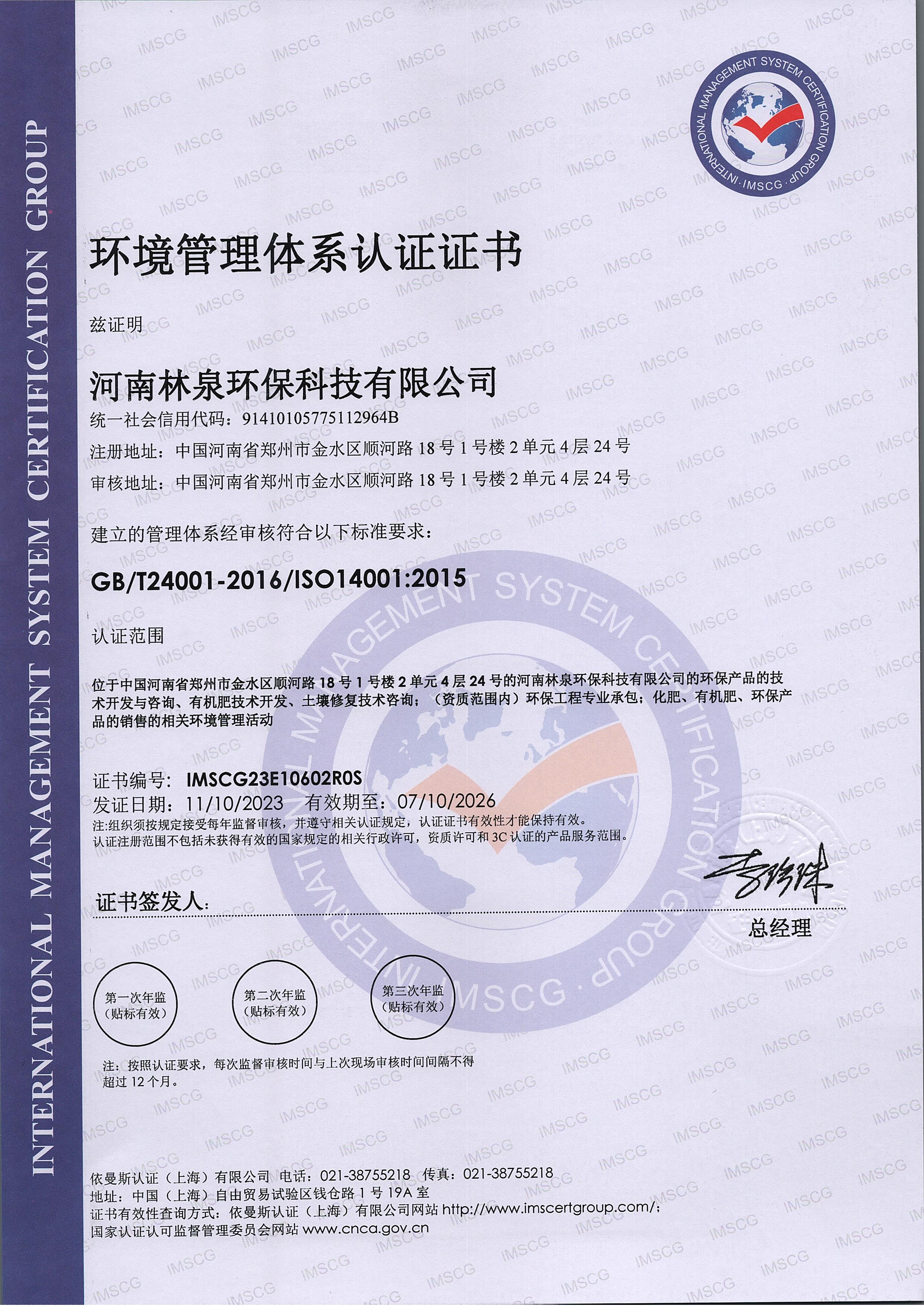 环境管理体系认证证书